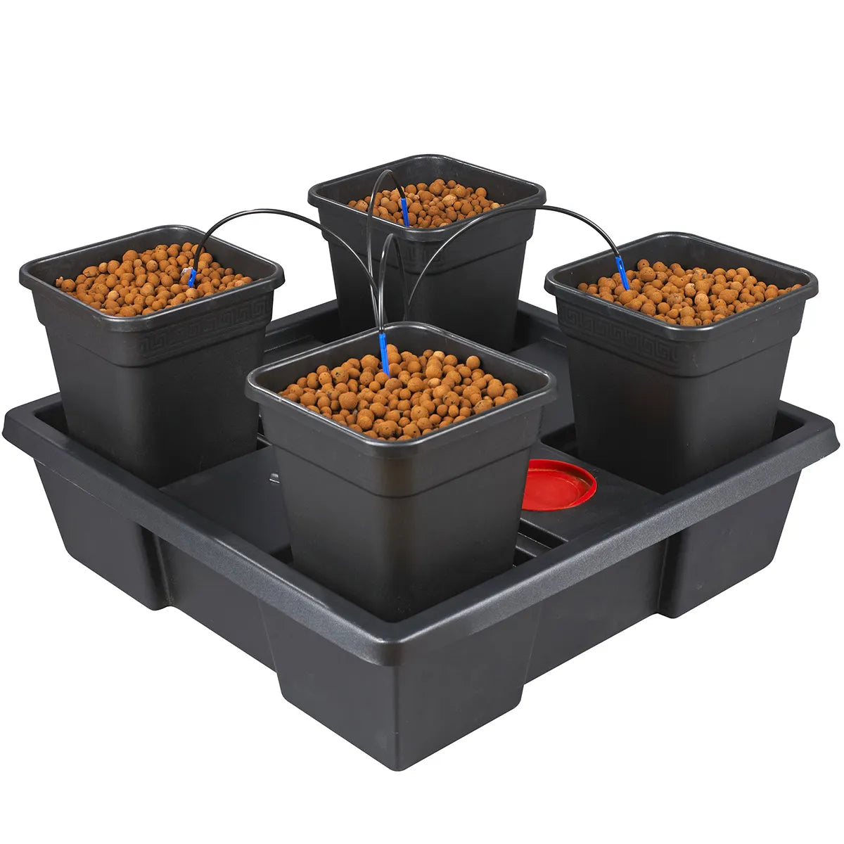 In Origin (Wilma) Systems, nutrient solution is held in a reservoir which is also the base of the system. A water pump is used to pump the nutrient solution from the reservoir, through the drip-lines and out through drippers inserted into each of the pots, which sit on a collection tray on top of the reservoir. The nutrient solution then returns to the reservoir ready to be used again.