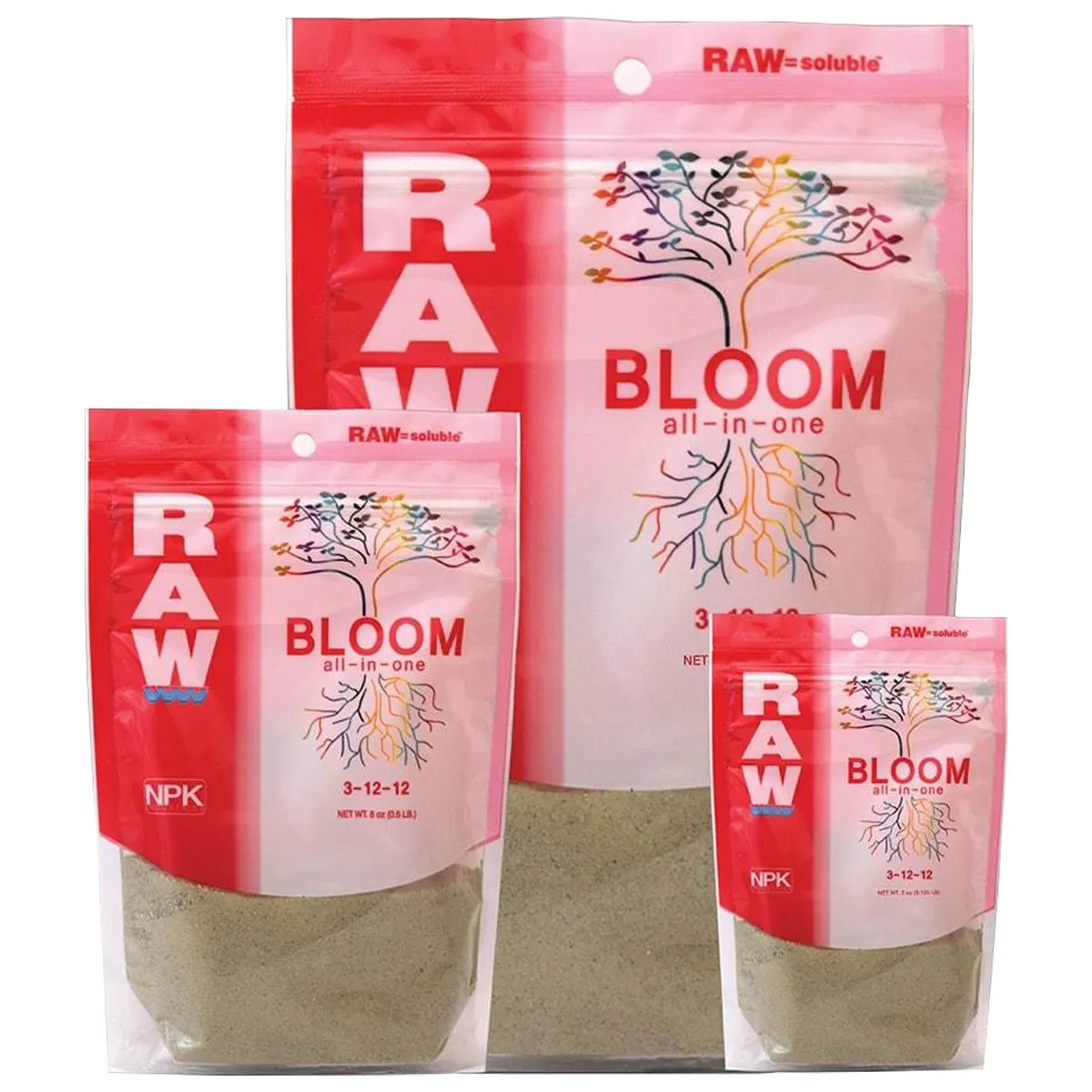 RAW BLOOM is a tested blend of all 12 RAW Soluble plant nutrients, essential elements and supplements. This blend has been proven to be an optimal all in one base “Bloom” horticultural fertilizer. RAW BLOOM is used through out the entire flowering stage. Derived from: Plant protein hydrolysate, mono potassium phosphate, potassium sulfate, cane molasses, sodium borate, iron DTPA, magnesium sulfate, manganese sulfate and natural volcanic ash. Also contains non-plant food ingredients: Humic acids derived from leonardite and peat, kelp (ascophyllum nodosum), silicon dioxide derived from diatomite and yucca extract.