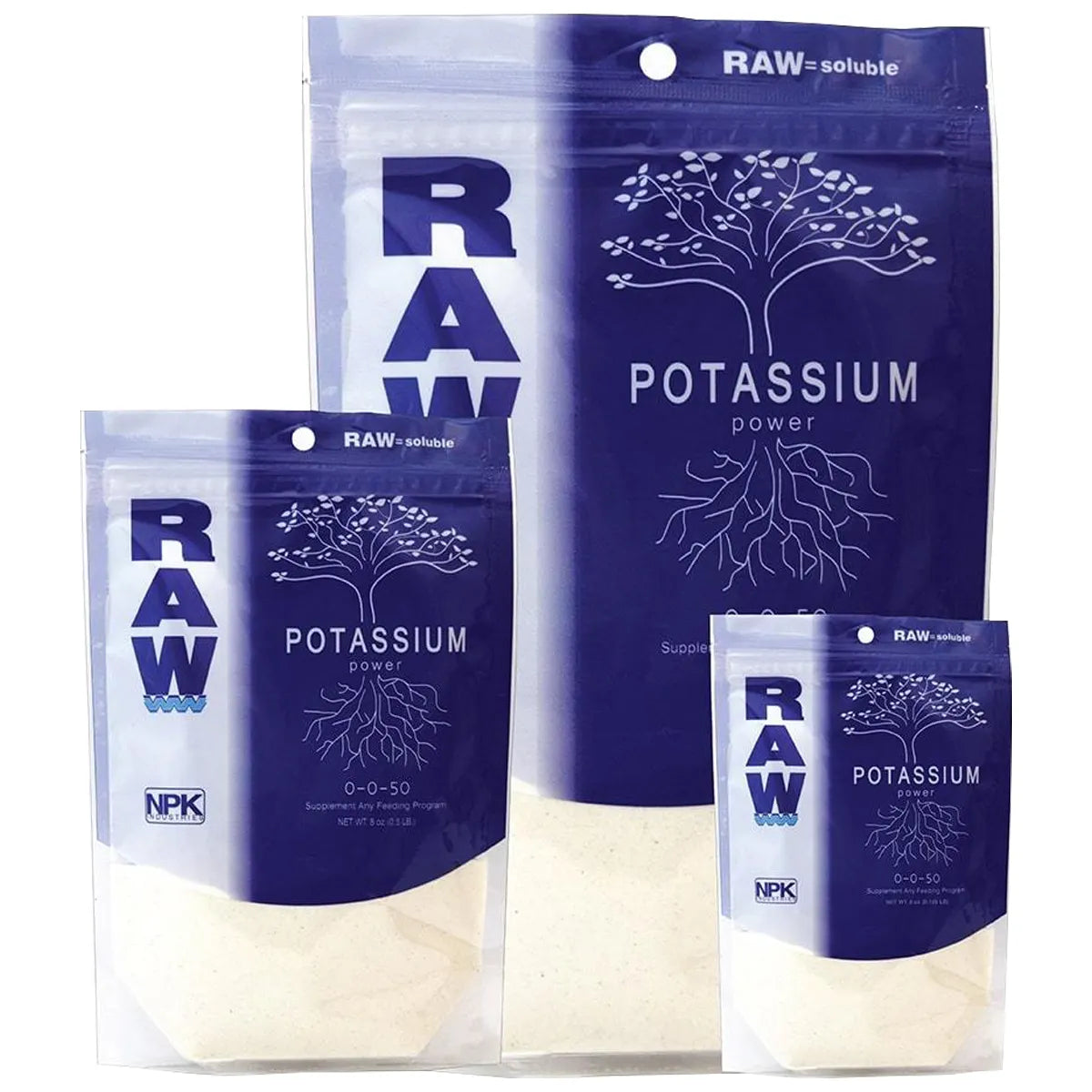 As plants enter the bloom phase, the demand for potassium (K) increases. If feeding schedules are not adjusted accordingly, plants can quickly becomes deficient. Raw Potassium is a high-grade powdered nutrient that's ideal for treating deficiencies and for tailoring feeding regimens to your exact requirements. It can be used with pretty much any growing medium or grow system, including soil, coco and hydroponics (not organics).